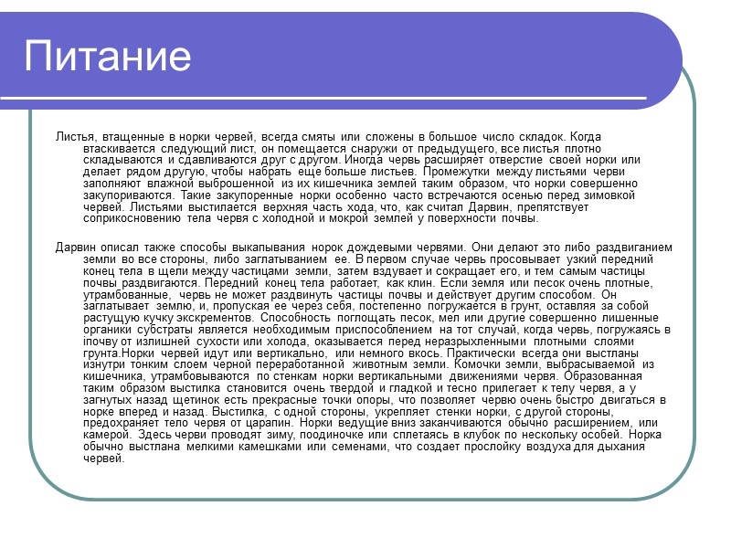 Питание Листья, втащенные в норки червей, всегда смяты или сложены в большое число складок. Когда втаскивается следующий лист, он помещается снаружи от предыдущего, все листья плотно складываются и сдавливаются друг с другом. Иногда червь расширяет отверстие своей норки или делает рядом другую, чтобы набрать еще больше листьев. Промежутки между листьями черви заполняют влажной выброшенной из их кишечника землей таким образом, что норки совершенно закупориваются. Такие закупоренные норки особенно часто встречаются осенью перед зимовкой червей. Листьями выстилается верхняя часть хода, что, как считал Дарвин, препятствует соприкосновению тела червя с холодной и мокрой землей у поверхности почвы. Дарвин описал также способы выкапывания норок дождевыми червями. Они делают это либо раздвиганием земли во все стороны, либо заглатыванием ее. В первом случае червь просовывает узкий передний конец тела в щели между частицами земли, затем вздувает и сокращает его, и тем самым частицы почвы раздвигаются. Передний конец тела работает, как клин. Если земля или песок очень плотные, утрамбованные, червь не может раздвинуть частицы почвы и действует другим способом. Он заглатывает землю, и, пропуская ее через себя, постепенно погружается в грунт, оставляя за собой растущую кучку экскрементов. Способность поглощать песок, мел или другие совершенно лишенные органики субстраты является необходимым приспособлением на тот случай, когда червь, погружаясь в iпочву от излишней сухости или холода, оказывается перед неразрыхленными плотными слоями грунта.Норки червей идут или вертикально, или немного вкось. Практически всегда они выстланы изнутри тонким слоем черной переработанной животным земли. Комочки земли, выбрасываемой из кишечника, утрамбовываются по стенкам норки вертикальными движениями червя. Образованная таким образом выстилка становится очень твердой и гладкой и тесно прилегает к телу червя, а у загнутых назад щетинок есть прекрасные точки опоры, что позволяет червю очень быстро двигаться в норке вперед и назад. Выстилка, с одной стороны, укрепляет стенки норки, с другой стороны, предохраняет тело червя от царапин. Норки ведущие вниз заканчиваются обычно расширением, или камерой. Здесь черви проводят зиму, поодиночке или сплетаясь в клубок по нескольку особей. Норка обычно выстлана мелкими камешками или семенами, что создает прослойку воздуха для дыхания червей.