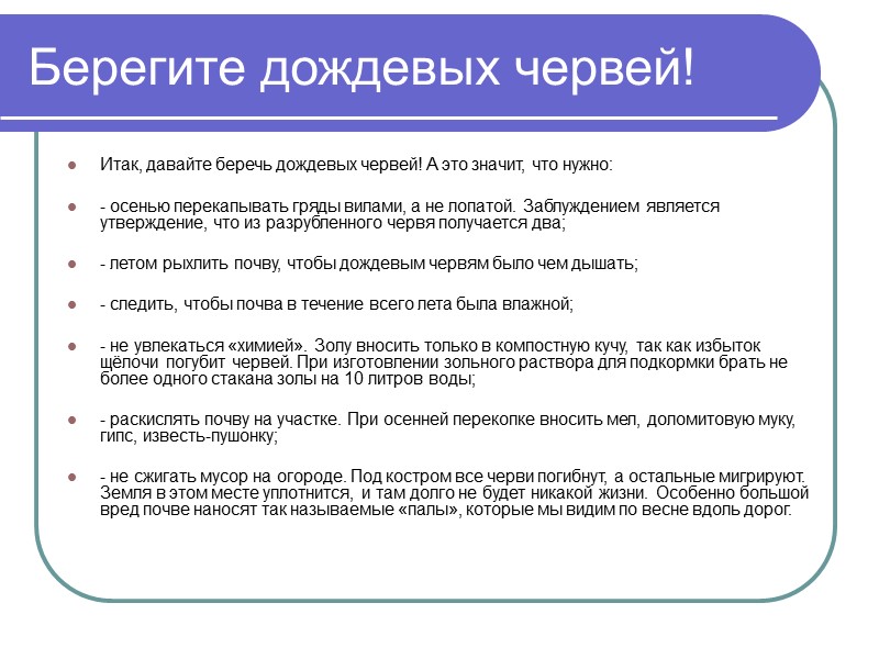Берегите дождевых червей! Итак, давайте беречь дождевых червей! А это значит, что нужно: - осенью перекапывать гряды вилами, а не лопатой. Заблуждением является утверждение, что из разрубленного червя получается два; - летом рыхлить почву, чтобы дождевым червям было чем дышать; - следить, чтобы почва в течение всего лета была влажной; - не увлекаться «химией». Золу вносить только в компостную кучу, так как избыток щёлочи погубит червей. При изготовлении зольного раствора для подкормки брать не более одного стакана золы на 10 литров воды; - раскислять почву на участке. При осенней перекопке вносить мел, доломитовую муку, гипс, известь-пушонку; - не сжигать мусор на огороде. Под костром все черви погибнут, а остальные мигрируют. Земля в этом месте уплотнится, и там долго не будет никакой жизни. Особенно большой вред почве наносят так называемые «палы», которые мы видим по весне вдоль дорог.