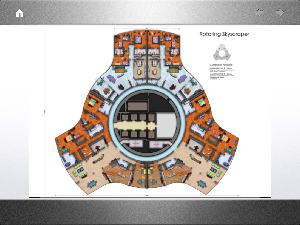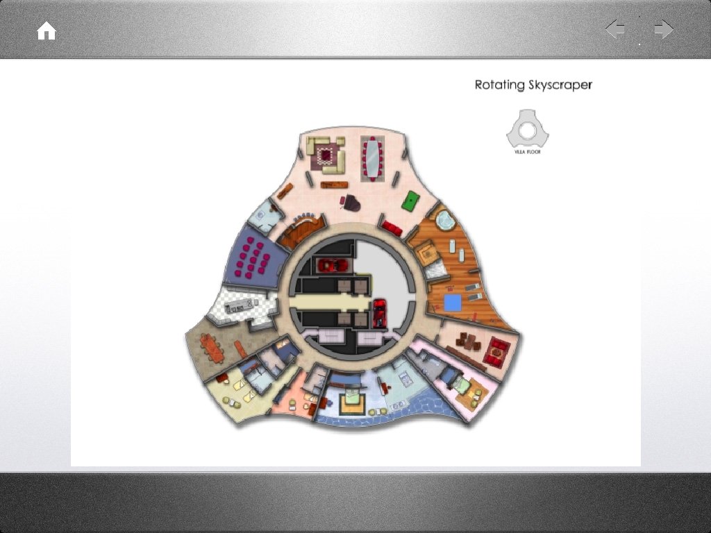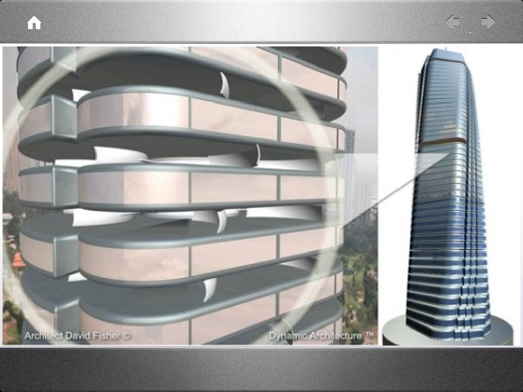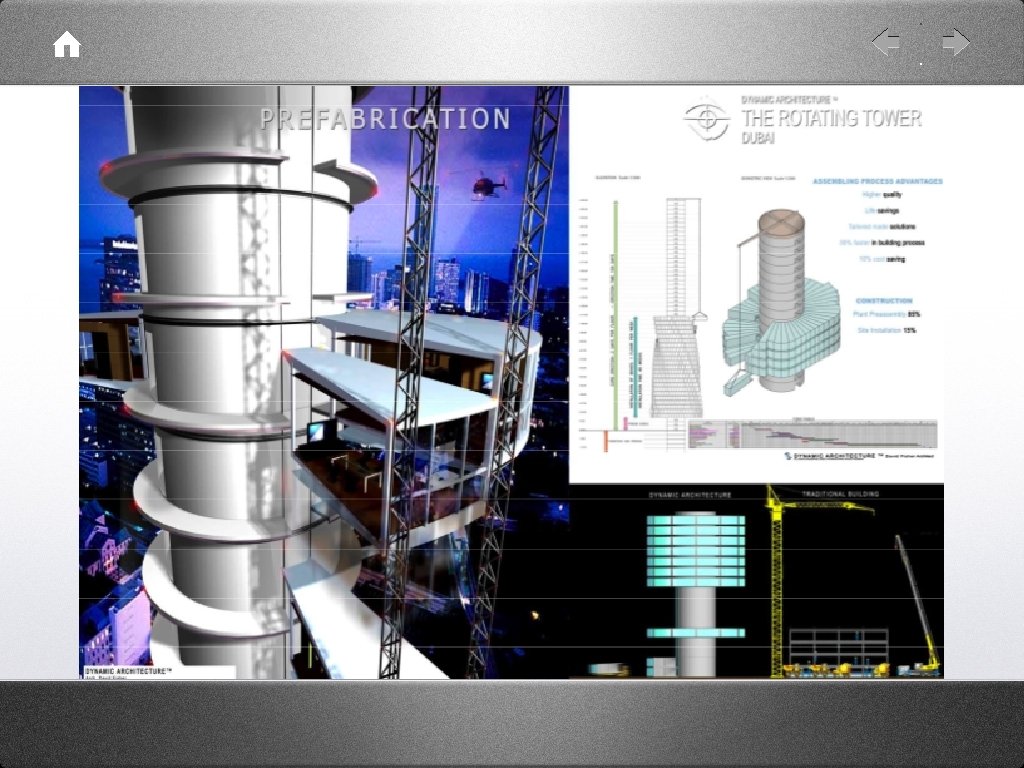 • • “The Rotating Tower Of Dubai will be the First Industrial Skyscraper ever constructed. 90% of the building will be prefabricated and assembled on a central core, the only part built with traditional reinforced concrete poured on the site. ” “I call the non-moving buildings Tombstones. . . buildings should start being part of the universe, and therefore dynamic. . . How could one think that digital homes of future will be as immobile as our grandmother’s house. ”
