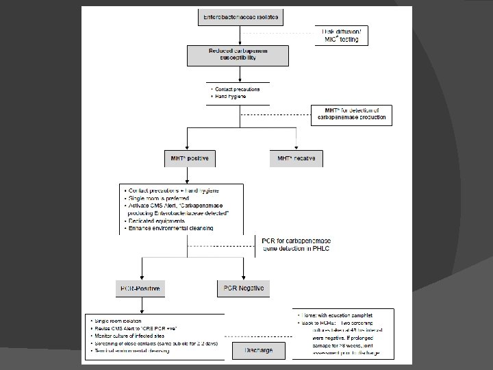 Enterobacteriaceae resistant or moderately resistant to Carbapenem PCR test for carbapenemase gene Isolates that are susceptible but with increased minimal inhibitory concentrations (MIC) Modified Hodge Test test sample -ve control +ve control If positive Modified Hodge Test proceed to PCR test for gene identity manage as CRE Clinical and Laboratory Standards Institute. 2009 performance standards for antimicrobial susceptibility testing. 2009.