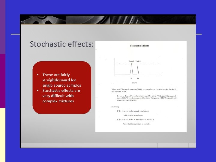Characteristics of Low Copy Number DNA Testing: Stochastic Effects Stochastic effects: Ø Ø Ø Increased heterozygote peak imbalance “Drop-out” (extreme form of PHI) Increased baseline Increased stutter (artifactual PCR peaks) Increased “drop-in” or contamination “Drop-in” and “drop-out” confounds the ability to determine with accuracy the true number of contributors (source attribution error in LCN)