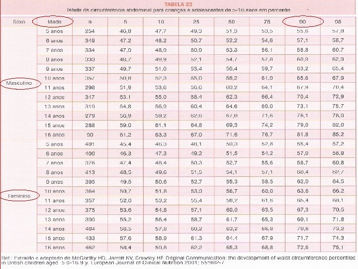SÍNDROME METABÓLICA NA INF NCIA E ADOLESCÊNCIA- CIRCUNFERÊNCIA ABDOMINAL J Ped (Rio J. ) 83(2), 2007 De Almeida e col. Avaliados 624 indvíduos entre 7 e 18 anos de duas escolas públicas Insulinemia, glicemia, leptina e colesterol total. Avaliados peso, estatura e cicunferência abdominal e montadas tabelas de contingência e avaliada presença ou ausência de CA de acordo com as tabelas de Freedman (p 90) e Taylor (p 80). A tabela de Taylor é melhor do ponto de vista de triagem A tabela de Freedman é mais adequada para estudos clínicos pela maior especificidade