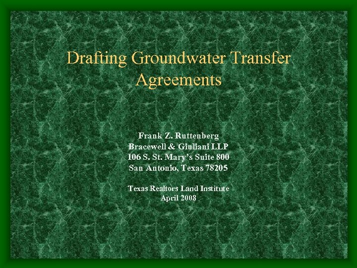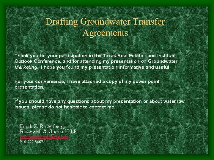 Drafting Groundwater Transfer Agreements Thank you for your participation in the Texas Real Estate Land Institute Outlook Conference, and for attending my presentation on Groundwater Marketing. I hope you found my presentation informative and useful. For your convenience, I have attached a copy of my power point presentation. If you should have any questions about my presentation or about water law issues, please do not hesitate to contact me. Frank Z. Ruttenberg Bracewell & Giuliani LLP Frank. ruttenberg@bgllp. com 210 299 -3467