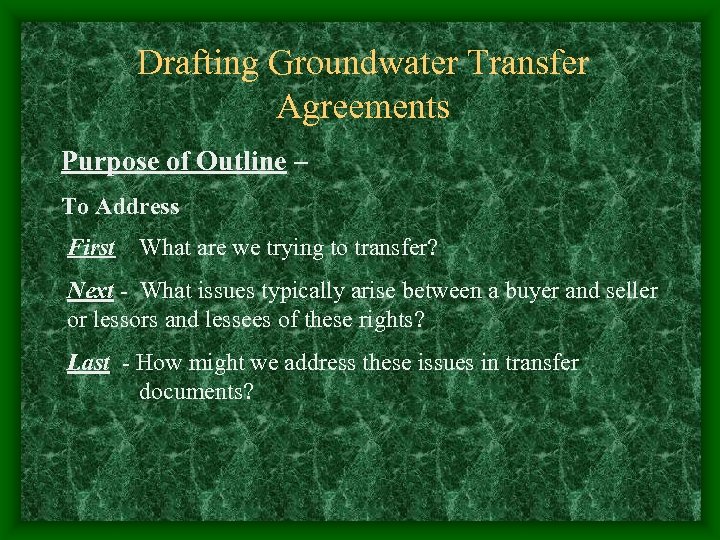 Drafting Groundwater Transfer Agreements Purpose of Outline – To Address First What are we trying to transfer? Next - What issues typically arise between a buyer and seller or lessors and lessees of these rights? Last - How might we address these issues in transfer documents?