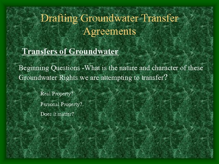 Drafting Groundwater Transfer Agreements Transfers of Groundwater Beginning Questions -What is the nature and character of these Groundwater Rights we are attempting to transfer? Real Property? Personal Property? Does it matter?