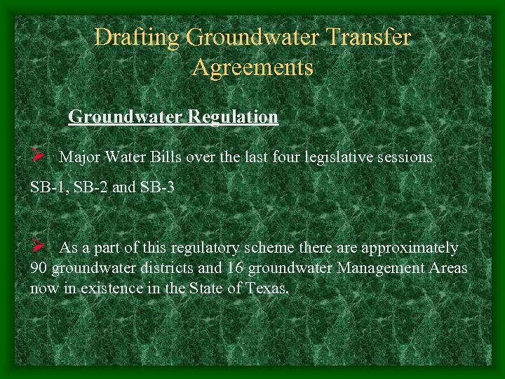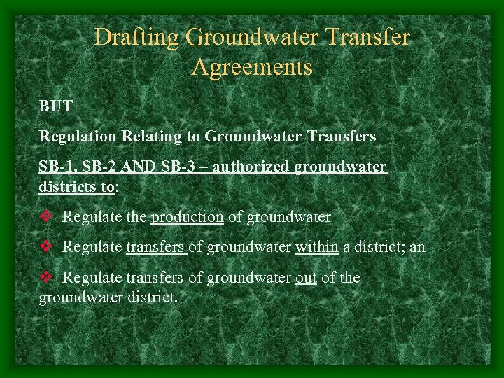 Drafting Groundwater Transfer Agreements BUT Regulation Relating to Groundwater Transfers SB-1, SB-2 AND SB-3 – authorized groundwater districts to: v Regulate the production of groundwater v Regulate transfers of groundwater within a district; an v Regulate transfers of groundwater out of the groundwater district.