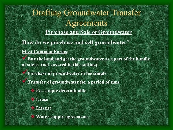 Drafting Groundwater Transfer Agreements Purchase and Sale of Groundwater How do we purchase and sell groundwater? Most Common Forms: üBuy the land get the groundwater as a part of the bundle of sticks (not covered in this outline) üPurchase of groundwater in fee simple üTransfer of groundwater for a period of time v Fee simple determinable v Lease v License v Water supply agreements