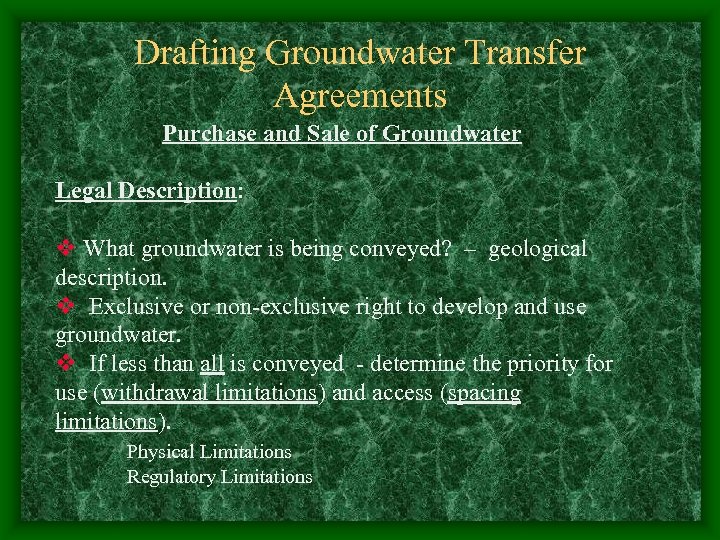 Drafting Groundwater Transfer Agreements Purchase and Sale of Groundwater Legal Description: v What groundwater is being conveyed? – geological description. v Exclusive or non-exclusive right to develop and use groundwater. v If less than all is conveyed - determine the priority for use (withdrawal limitations) and access (spacing limitations). Physical Limitations Regulatory Limitations