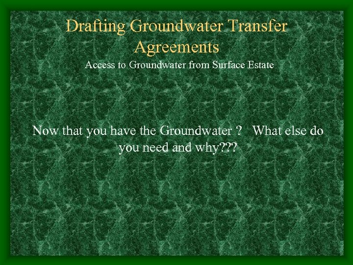 Drafting Groundwater Transfer Agreements Access to Groundwater from Surface Estate Now that you have the Groundwater ? What else do you need and why? ? ?