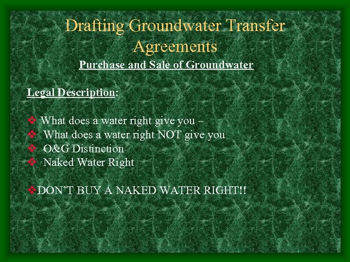 Drafting Groundwater Transfer Agreements Purchase and Sale of Groundwater Legal Description: v What does a water right give you – v What does a water right NOT give you v O&G Distinction v Naked Water Right v. DON’T BUY A NAKED WATER RIGHT!!