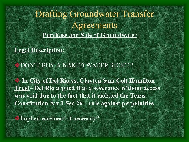 Drafting Groundwater Transfer Agreements Purchase and Sale of Groundwater Legal Description: v. DON’T BUY A NAKED WATER RIGHT!! v In City of Del Rio vs. Clayton Sam Colt Hamilton Trust– Del Rio argued that a severance without access was void due to the fact that it violated the Texas Constitution Art 1 Sec 26 – rule against perpetuities v. Implied easement of necessity?