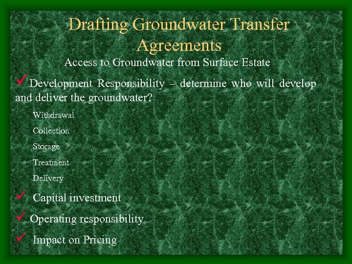 Drafting Groundwater Transfer Agreements Access to Groundwater from Surface Estate Operating covenants or behavioral covenants relating to the Landowner’s use of the surface estate; üGroundwater Owner wants: v Flexibility as to placement of facilities at beginning and in future; v Access for construction maintenance and operations; v Restricted use by landowner that will not interfere withdrawal of groundwater; v Limitations on surface penetrations (Oil and Gas); v Limits on environmentally harmful use - sanitary control easements;