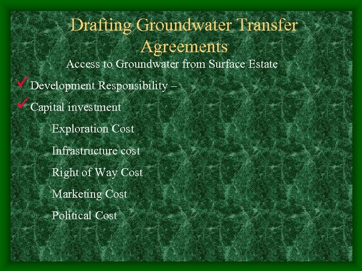 Drafting Groundwater Transfer Agreements Access to Groundwater from Surface Estate üDevelopment Responsibility – üCapital investment Exploration Cost Infrastructure cost Right of Way Cost Marketing Cost Political Cost