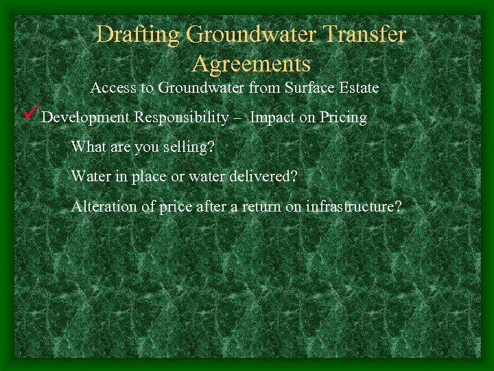 Drafting Groundwater Transfer Agreements Access to Groundwater from Surface Estate üDevelopment Responsibility – Impact on Pricing What are you selling? Water in place or water delivered? Alteration of price after a return on infrastructure?