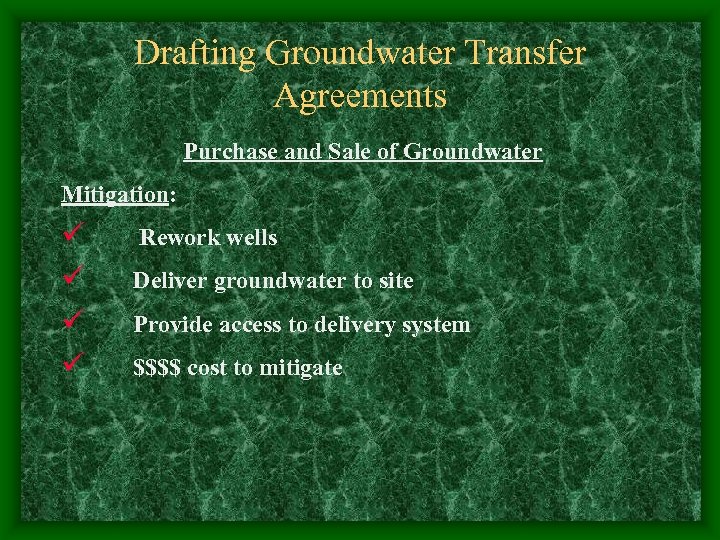 Drafting Groundwater Transfer Agreements Purchase and Sale of Groundwater Mitigation: ü ü Rework wells Deliver groundwater to site Provide access to delivery system $$$$ cost to mitigate