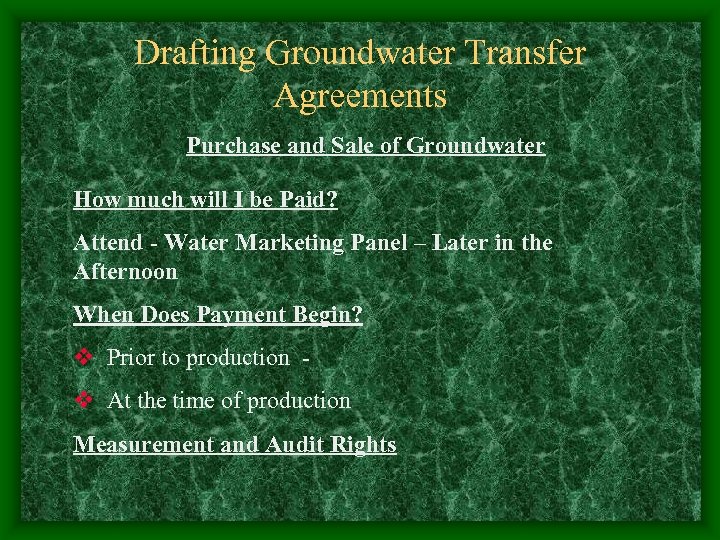 Drafting Groundwater Transfer Agreements Purchase and Sale of Groundwater How much will I be Paid? Attend - Water Marketing Panel – Later in the Afternoon When Does Payment Begin? v Prior to production - v At the time of production Measurement and Audit Rights