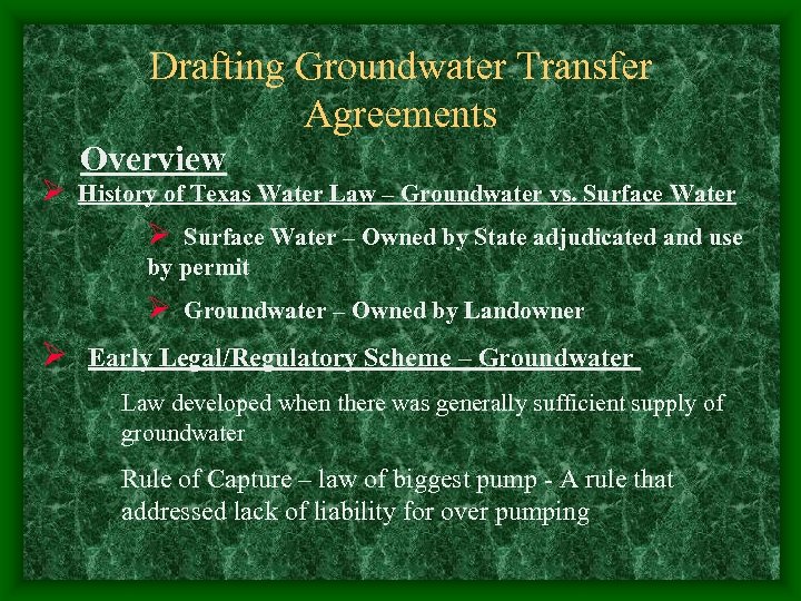 Drafting Groundwater Transfer Agreements Overview Ø History of Texas Water Law – Groundwater vs. Surface Water Ø Surface Water – Owned by State adjudicated and use by permit Ø Groundwater – Owned by Landowner Ø Early Legal/Regulatory Scheme – Groundwater Law developed when there was generally sufficient supply of groundwater Rule of Capture – law of biggest pump - A rule that addressed lack of liability for over pumping