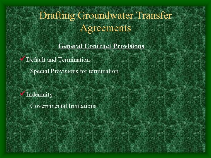 Drafting Groundwater Transfer Agreements General Contract Provisions üDefault and Termination Special Provisions for termination üIndemnity Governmental limitations