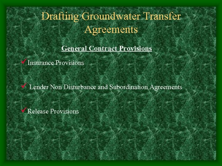 Drafting Groundwater Transfer Agreements General Contract Provisions üInsurance Provisions ü Lender Non Disturbance and Subordination Agreements üRelease Provisions
