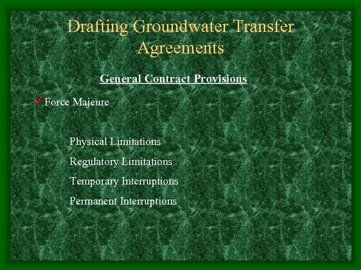 Drafting Groundwater Transfer Agreements General Contract Provisions üForce Majeure Physical Limitations Regulatory Limitations Temporary Interruptions Permanent Interruptions