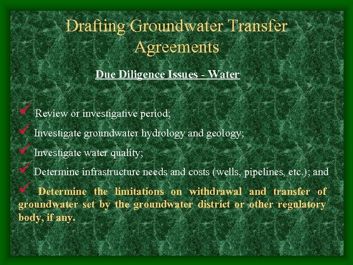 Drafting Groundwater Transfer Agreements Due Diligence Issues - Water ü Review or investigative period; ü Investigate groundwater hydrology and geology; ü Investigate water quality; ü Determine infrastructure needs and costs (wells, pipelines, etc. ); and ü Determine the limitations on withdrawal and transfer of groundwater set by the groundwater district or other regulatory body, if any.