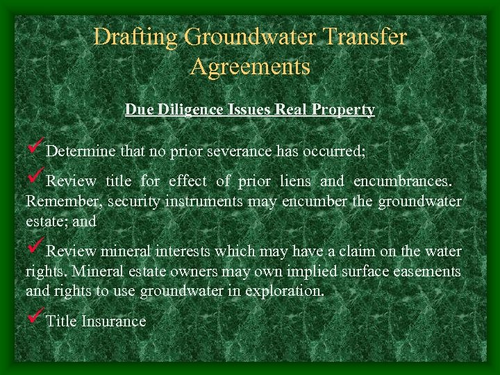Drafting Groundwater Transfer Agreements Due Diligence Issues Real Property üDetermine that no prior severance has occurred; üReview title for effect of prior liens and encumbrances. Remember, security instruments may encumber the groundwater estate; and üReview mineral interests which may have a claim on the water rights. Mineral estate owners may own implied surface easements and rights to use groundwater in exploration. üTitle Insurance