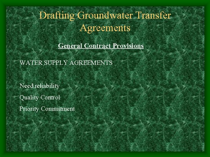 Drafting Groundwater Transfer Agreements General Contract Provisions WATER SUPPLY AGREEMENTS Need reliability Quality Control Priority Commitment