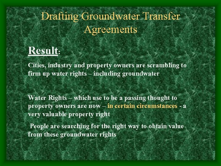 Drafting Groundwater Transfer Agreements Result: Cities, industry and property owners are scrambling to firm up water rights – including groundwater Water Rights – which use to be a passing thought to property owners are now – in certain circumstances - a very valuable property right People are searching for the right way to obtain value from these groundwater rights