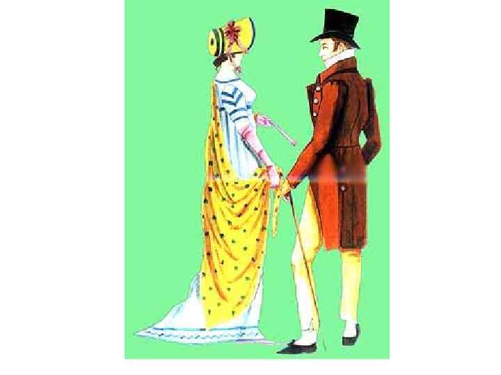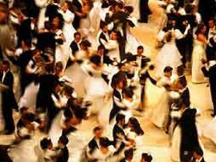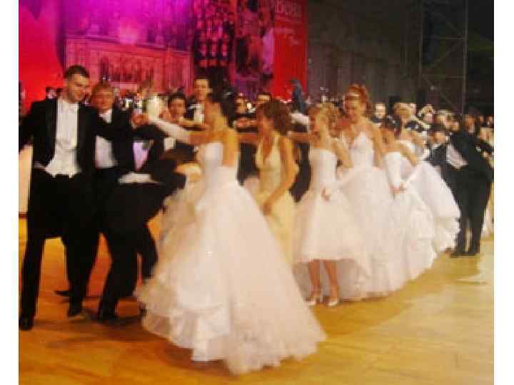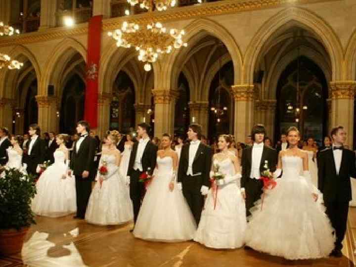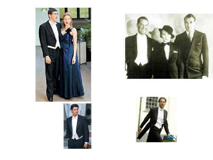 • На бал приходили одетыми парадно. • Кавалеры - во фраке, смокинге или костюме (в зависимости от десятилетия), белой рубашке и обязательно в белых перчатках. • Причем в руководствах дама имеет право отказать кавалеру без перчаток, и для кавалера лучше прийти на бал в черных перчатках, чем без перчаток вообще.