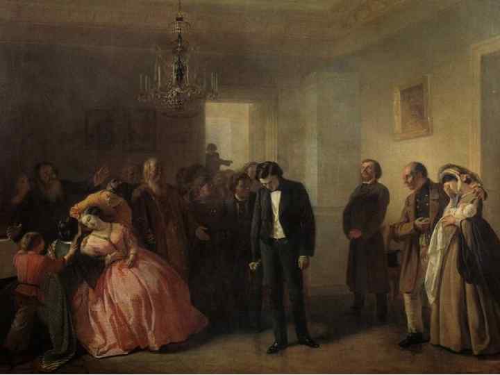 Эдуард Мане, Балкон. Лувр, Париж. Двубортный пиджак, который на рубеже столетий вытесняет фрак, дополнен галстуком с опущенными концами.