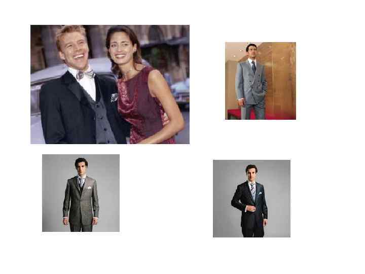 BLACK TIE OPTIONAL, СOCKTAIL, SEMI-FORMAL • Это варианты полуформальных дресс-кодов, позволяющих делать отступления от строгих правил протокольных мероприятий. • В этом случае можно прийти на торжество как в смокинге, так и в классическом костюме. • Данный дресс-код разрешает мужчине появляться в обычном классическом костюме идеального кроя из качественной ткани. • Сопровождающая дама должна быть одета в элегантное платье для коктейля, которое не должно выглядеть вычурным или излишне вечерним.
