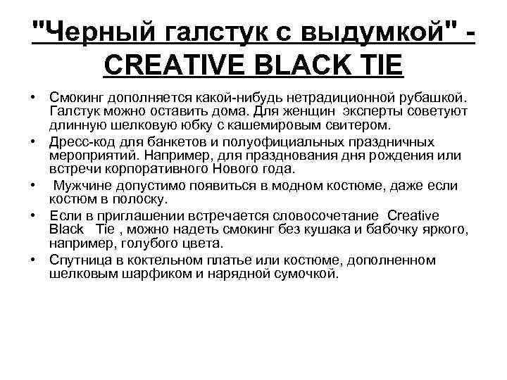 "Черный галстук с выдумкой" - CREATIVE BLACK TIE • Смокинг дополняется какой-нибудь нетрадиционной рубашкой. Галстук можно оставить дома. Для женщин эксперты советуют длинную шелковую юбку с кашемировым свитером. • Дресс-код для банкетов и полуофициальных праздничных мероприятий. Например, для празднования дня рождения или встречи корпоративного Нового года. • Мужчине допустимо появиться в модном костюме, даже если костюм в полоску. • Если в приглашении встречается словосочетание Creative Black Tie , можно надеть смокинг без кушака и бабочку яркого, например, голубого цвета. • Спутница в коктельном платье или костюме, дополненном шелковым шарфиком и нарядной сумочкой.