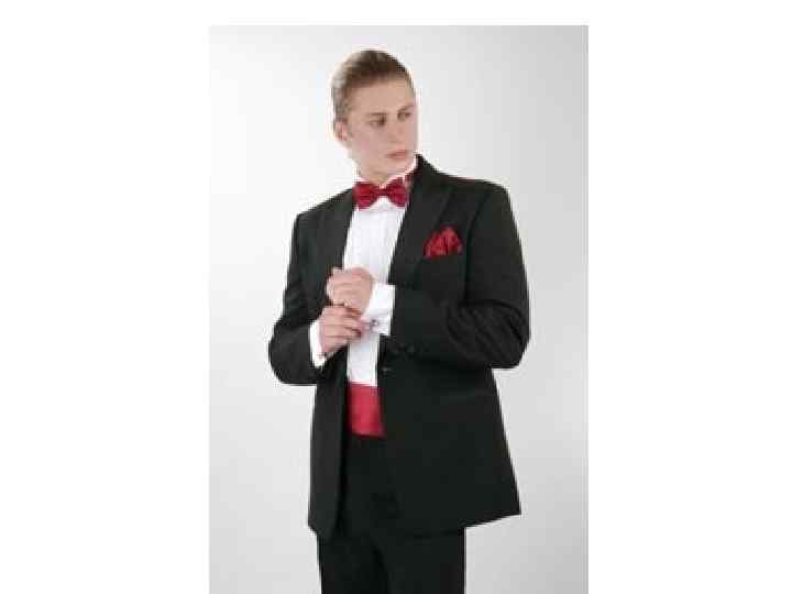 • • • Под смокинг надевают рубашку с воротникомбабочкой, обязателен платочек для нагрудного кармана и традиционно кушак (с белым смокингом -белый, счерным - черный). Кушак легко заменяется на жилет. К смокингу надевают брюки, обязательным атрибутом которых являются лампасы из того же шелка, каким обшиты лацканы смокинга, а также белую сорочку, отличительной особенностью которой является потайная полочка и двойные манжеты. . . Полагается надевать черные туфли на шнурках, но ни в коем случае не лаковые.