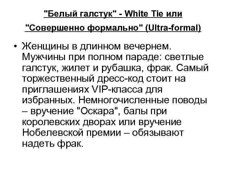 "Белый галстук" - White Tie или "Совершенно формально" (Ultra-formal) • Женщины в длинном вечернем. Мужчины при полном параде: светлые галстук, жилет и рубашка, фрак. Самый торжественный дресс-код стоит на приглашениях VIP-класса для избранных. Немногочисленные поводы – вручение "Оскара", балы при королевских дворах или вручение Нобелевской премии – обязывают надеть фрак.