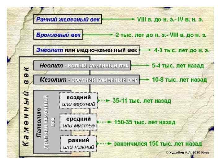 Археологическая периодизация (периодизация основана на различиях в материале и технике изготовления орудий труда ) 1. Каменный век (от возникновения человека до III тыс. до н. э. ) 2. Бронзовый век (с конца IV до начала 1 тыс. до н. э. ) 3. Железный век (с 1 тыс. до н. э. - до наших дней).