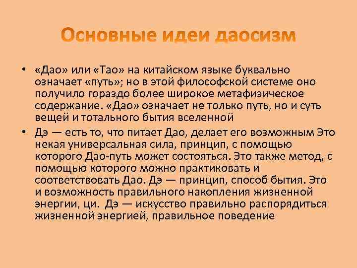 • «Дао» или «Тао» на китайском языке буквально означает «путь» ; но в этой философской системе оно получило гораздо более широкое метафизическое содержание. «Дао» означает не только путь, но и суть вещей и тотального бытия вселенной • Дэ — есть то, что питает Дао, делает его возможным Это некая универсальная сила, принцип, с помощью которого Дао-путь может состояться. Это также метод, с помощью которого можно практиковать и соответствовать Дао. Дэ — принцип, способ бытия. Это и возможность правильного накопления жизненной энергии, ци. Дэ — искусство правильно распорядиться жизненной энергией, правильное поведение