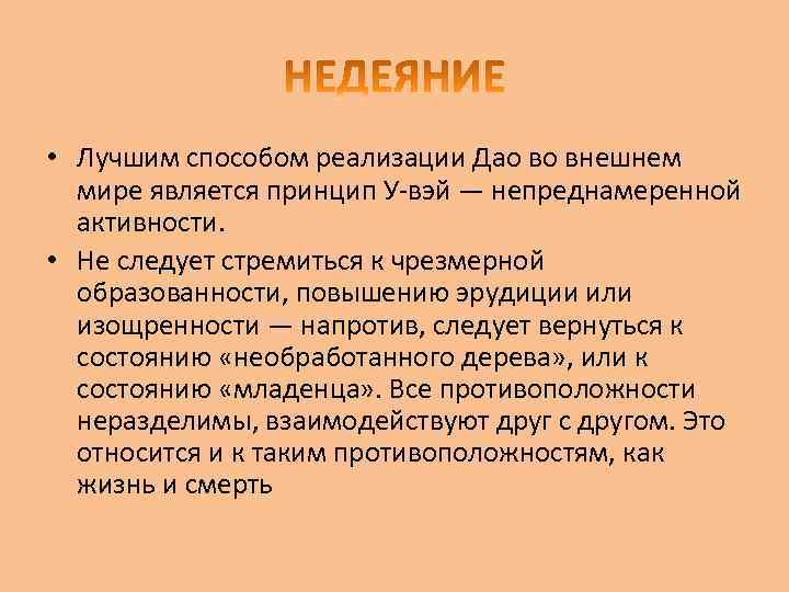• Лучшим способом реализации Дао во внешнем мире является принцип У-вэй — непреднамеренной активности. • Не следует стремиться к чрезмерной образованности, повышению эрудиции или изощренности — напротив, следует вернуться к состоянию «необработанного дерева» , или к состоянию «младенца» . Все противоположности неразделимы, взаимодействуют друг с другом. Это относится и к таким противоположностям, как жизнь и смерть