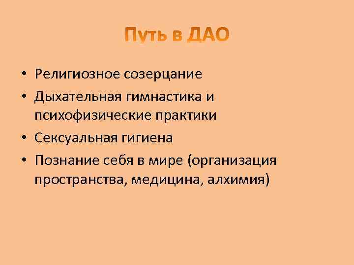 • Религиозное созерцание • Дыхательная гимнастика и психофизические практики • Сексуальная гигиена • Познание себя в мире (организация пространства, медицина, алхимия)