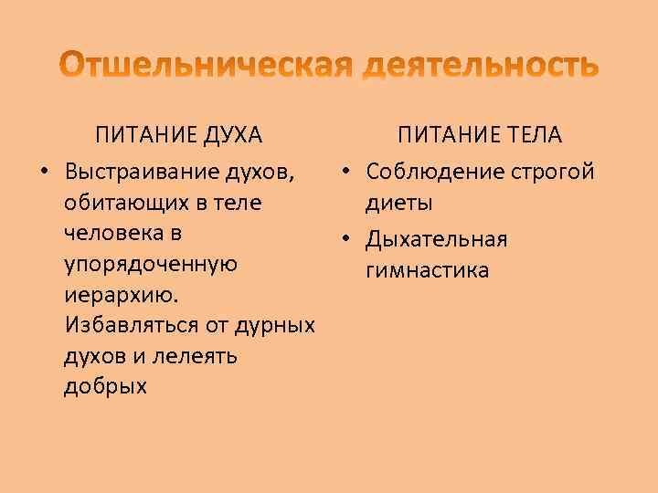 ПИТАНИЕ ДУХА ПИТАНИЕ ТЕЛА • Выстраивание духов, • Соблюдение строгой обитающих в теле диеты человека в • Дыхательная упорядоченную гимнастика иерархию. Избавляться от дурных духов и лелеять добрых