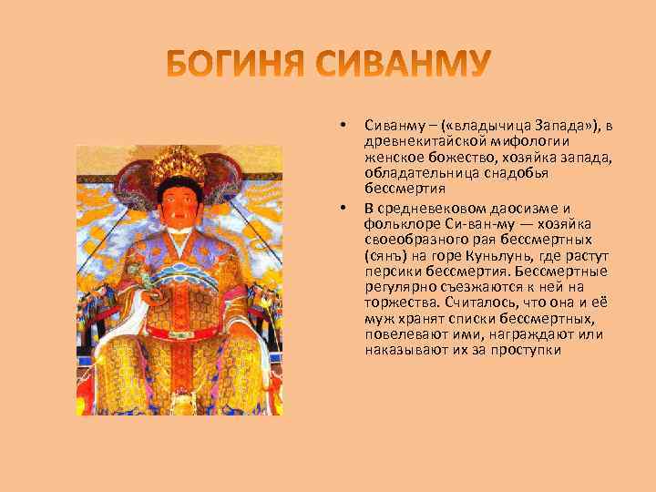 • • Сиванму – ( «владычица Запада» ), в древнекитайской мифологии женское божество, хозяйка запада, обладательница снадобья бессмертия В средневековом даосизме и фольклоре Си-ван-му — хозяйка своеобразного рая бессмертных (сянъ) на горе Куньлунь, где растут персики бессмертия. Бессмертные регулярно съезжаются к ней на торжества. Считалось, что она и её муж хранят списки бессмертных, повелевают ими, награждают или наказывают их за проступки