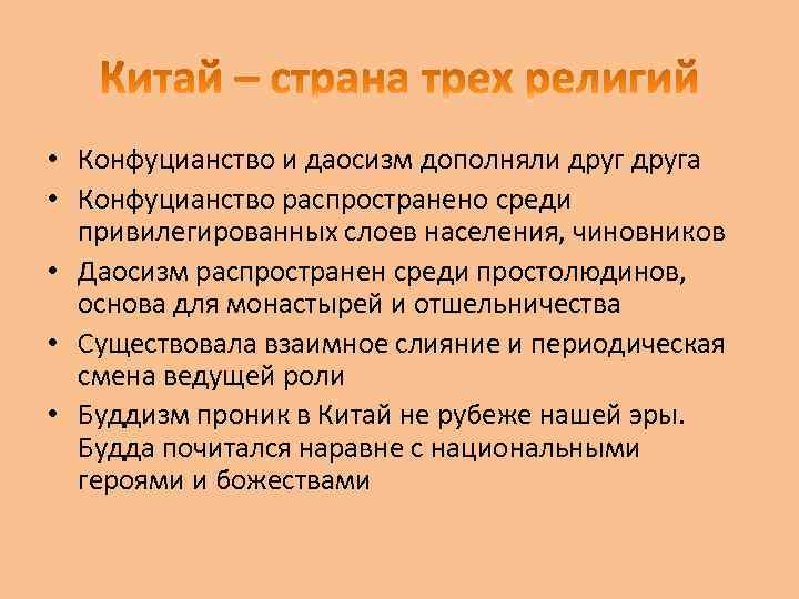 • Конфуцианство и даосизм дополняли друга • Конфуцианство распространено среди привилегированных слоев населения, чиновников • Даосизм распространен среди простолюдинов, основа для монастырей и отшельничества • Существовала взаимное слияние и периодическая смена ведущей роли • Буддизм проник в Китай не рубеже нашей эры. Будда почитался наравне с национальными героями и божествами