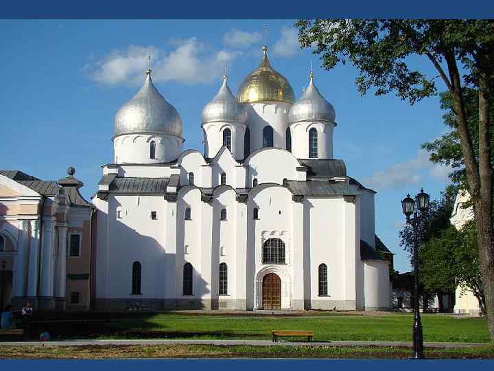 Собор Святой Софии в Новгороде • София Новгородская – символ города. «Где Святая София, там и Новгород» – говорили в старину. • Новгородская София выглядит суровее, монументальнее Софии Киевской. Стены массивны, изредка прорезаются узкими окнами, собор в полтора раза выше киевского. Изнутри собор расписан фресками, из которых до нас дошли лишь небольшие фрагменты.