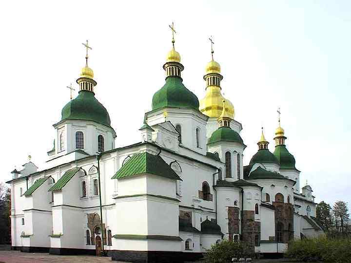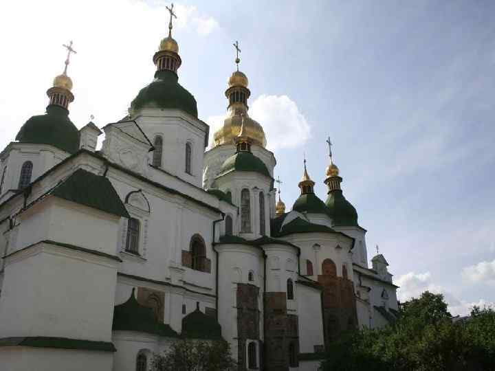 Собор Святой Софии в Киеве • Собор Святой Софии в Киеве построен во времена правления Ярослава Мудрого. Это крестово-купольный, пятинефный храм, окруженный с трех сторон двойным рядом галерей-гульбищ и увенчанный 13 куполами. Многокупольное завершение – чисто русское явление, берущее начало в грандиозных языческих капищах. • София Киевская не возносилась над землей, а гармонично разрасталась во все стороны, она создавала уходящую вверх пирамидальную композицию.