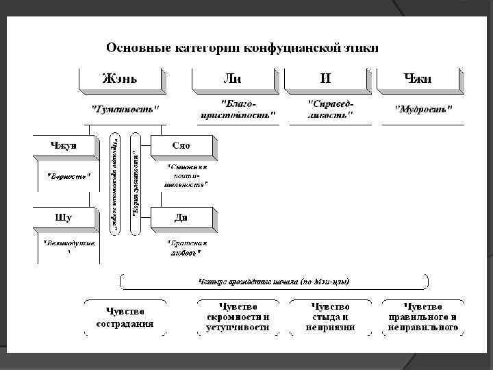 Регулятор жизни общества – строгое, безусловное повиновение старшим. Главная обязанность человека – сыновья почтительность – сяо.