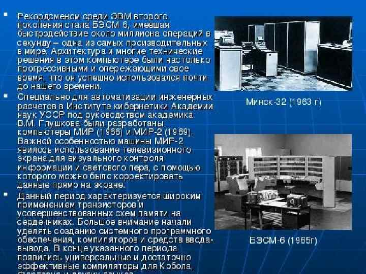 ОБНОВЛЕНИЕ n Элементной базой машин этого поколения были полупроводниковые приборы. Машины предназначались для решения различных трудоемких научно-технических задач, а также для управления технологическими процессами в производстве. Появление полупроводниковых элементов в электронных схемах существенно увеличило емкость оперативной памяти, надежность и быстродействие ЭВМ. Уменьшились размеры, масса и потребляемая мощность.