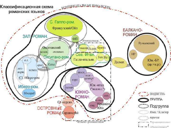 4 подгруппы РЯ: 1. Балкано-романская (румынский). 2. Итало-романская (итальянский, далматский, сардинский, ретороманский). 3. Галло-романская (французский, франкопровансальский, каталанский). 4. Иберо-романская (испанский, португальский, галисийский).