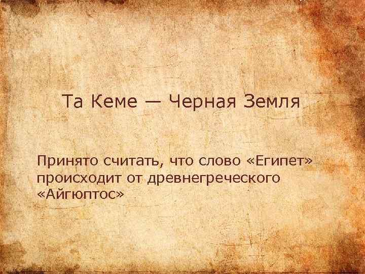 Та Кеме — Черная Земля Принято считать, что слово «Египет» происходит от древнегреческого «Айгюптос»