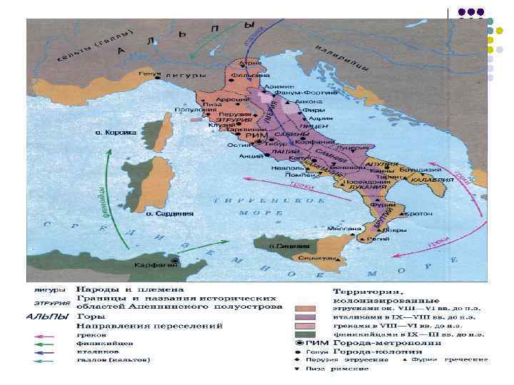 1. Царский и республиканский Рим l l l Пришлось сражаться римлянам и с Пирром. Войска Пирра одержали несколько побед над римлянами, но при этом понесли огромные потери. В историю вошли слова Пирра: «Еще одна такая победа, и я останусь без войска!» Завоевание Римом Италии вплоть до границ с Галлией завершилось в 265 до н. э. Потеряв свою государственность, этруски полностью смешались с местным населением. В результате культура этрусков исчезла.