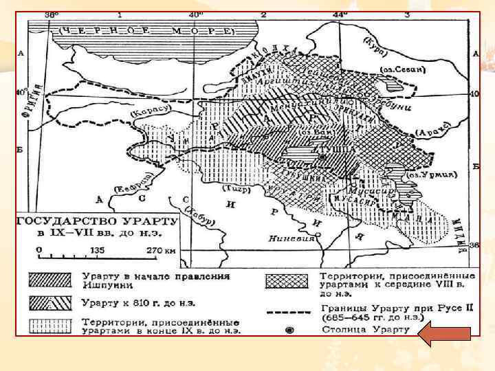 Урарту ü Государство Урарту находилось на большом нагорье, расположенном между Малой Азией, северо-западной окраиной Ирана и Северным Двуречьем. В IX в. до н. э. урартские племена объединились и создали государство Урарту. ü Столицей государство Урарту город - Тушпа. ü Территория Урарту со всех сторон была защищена горными хребтами и поэтому представляла естественные удобства для успешной защиты населения от набегов соседних племён и грабительских завоевательных походов, главным образом — ассирийских царей ü Язык и культура урартов оказали влияние на соседние народы, а также на те народы, которые населяли впоследствии территорию государства Урарту. Ассирийцы заимствовали некоторые урартские слова.