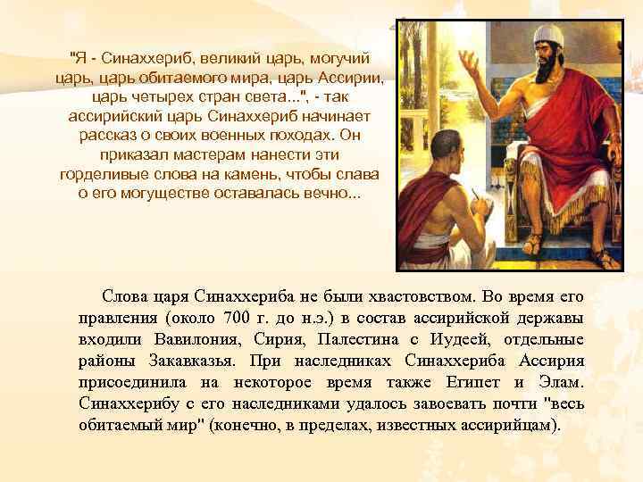 "Я - Синаххериб, великий царь, могучий царь, царь обитаемого мира, царь Ассирии, царь четырех стран света. . . ", - так ассирийский царь Синаххериб начинает рассказ о своих военных походах. Он приказал мастерам нанести эти горделивые слова на камень, чтобы слава о его могуществе оставалась вечно. . . Слова царя Синаххериба не были хвастовством. Во время его правления (около 700 г. до н. э. ) в состав ассирийской державы входили Вавилония, Сирия, Палестина с Иудеей, отдельные районы Закавказья. При наследниках Синаххериба Ассирия присоединила на некоторое время также Египет и Элам. Синаххерибу с его наследниками удалось завоевать почти "весь обитаемый мир" (конечно, в пределах, известных ассирийцам).